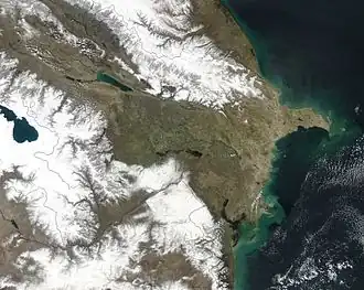 The elevation changes over a relatively short distance from lowlands to highlands; nearly half the country is considered mountainous.[1] Notable physical features are the gently undulating hills of the subtropical southeastern coast, which are covered with tea plantations, orange groves, and lemon groves; numerous mud volcanoes and mineral springs in the ravines of Kobustan Mountain near Baku; and coastal terrain that lies as much as twenty-eight meters below sea level.[1]