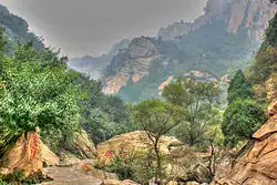 To the west is Xishan, also known as the Western Hills, which are visible from the city on clear days. Xishan forms the eastern flank of the Taihang Mountains range, which run north–south up the spine of Hebei province.[5] Xishan covers nearly all of Fangshan and Mentougou Districts west of the city. East Lingshan (elevation 2,303 metres (7,556 ft)), a Xishan peak on the border with Hebei, is the highest point in Beijing Municipality.[5] It is located 122 km (76 mi) from the city. Xishan is also known for high mountain meadows and scenic river gorges, including Shidu. Foothills of Xishan reach the city itself. They include Fragrant Hills, a major tourist attraction and Laoshan, the site of mountain bike competition in the 2008 Summer Olympics.