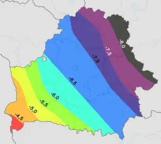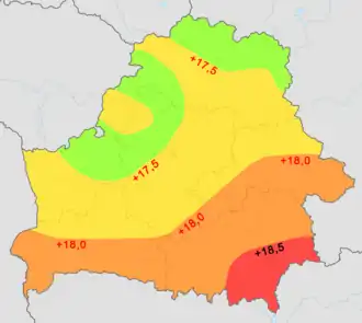 Because of the proximity of the Baltic Sea (257 kilometers or 160 miles at the closest point), the country has a temperate continental climate.[3] Winters last between 105 and 145 days, and summers last up to 150 days. The average temperature in January is −6 °C (21 °F), and the average temperature for July is about 18 °C (64 °F), with high humidity.[3] Average temperature for July ranges from 17.5 °C (64 °F) in the north, 18.5–19 °C (66 °F) in the south. For January, it ranges from −4.5 °C (24 °F) in the southwest to −8 °C (18 °F) in the northeast. Average annual precipitation ranges from 550 to 700 millimeters (21.7 to 27.6 in) and is sometimes excessive.[8][3]