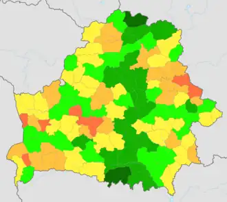 • Air quality in Belarus has been an issue for many years. Belarus is ranked third in the world for death associated with air pollution, 100 of every 100,000 deaths from 2010 to 2012.[13] However, in recent years the quality of the air has been improving by almost 50% according to the Organisation for Economic Co-operation and Development.[14] The increased use of natural gas and alternatives to coal is leading the fight against air pollution. Policies implemented in Belarus can also be seen as a leading cause of the quality of air improving. Fines and fees may be used to enforce rules and regulations and also to keep awareness of the issue known. The money brought in from the fees and fines are used by the Environmental Fund in Belarus.