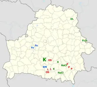 Belarus has a large number of potash deposits – all formed during the Famennian stage of the Late Devonian epoch – with commercial reserves of 10 billion metric tonnes. Three main potash deposits have been explored – Starobin (Belarusian: Старобінскае, Russian: Старобинское), Petrikov (Belarusian: Петрыкаўскае, Russian: Петриковское) and Oktyabrsky (Belarusian: Акцябрскае, Russian: Октябрьское). Sylvinite (potash ore) from these three deposits contains up to 28%, 40% and 39% KCl respectively. Amounts of MgCl2 vary from 0.15–0.3% in Starobin to 1.5–4% in Petrikov and more than 5% in Oktyabrsky. The Starobin deposit has 2.6 billion tonnes of proven reserves (A, B, C1 categories) and 600 million tonnes of prognosed reserves (C2 category) of potash. Reserves at the Petrikov deposit are estimated at 2.12 billion tonnes (C1 and C2 categories) of potash. The Oktyabrsky deposit has 637 million tonnes of potash (C1 and C2) and 1.1 billion tonnes of carnallite.[15] Only the Starobin deposit is used, but in 2014 construction of the first factory in the Petrikov deposit began.[15][16] Several smaller, less-explored deposits are known, mainly in Gomel and Minsk Regions.[15]