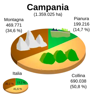 From a physical point of view, the Campania region can be divided into two areas: one mountainous and one flat:[2]