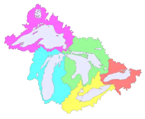A map of the Great Lakes Basin showing the five sub-basins within. Left to right they are: Superior, including Nipigon's basin, (magenta); Michigan (cyan); Huron (pale green); Erie (yellow); Ontario (light coral).