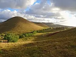 Rano Raraku and Maunga Toa Toa are isolated tuff cones of about 0.21 Ma. The crater of Rano Raraku contains a freshwater lake. The stratified tuff is composed of sideromelane, slightly altered to palagonite, and somewhat lithified. The tuff contains lithic fragments of older lava flows. The northwest sector of Rano Raraku contains reddish volcanic ash.[5] According to Bandy, "...all of the great images of Easter Island are carved from" the light and porous tuff from Rano Raraku. A carving was abandoned when a large, dense and hard lithic fragment was encountered. However, these lithics became the basis for stone hammers and chisels. The Puna Pau crater contains an extremely porous pumice, from which was carved the Pukao "hats". The Maunga Orito obsidian was used to make the "mataa" spearheads.[6]