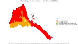 The distribution of rainfall and vegetation types varies markedly throughout the country. Eritrean climate varies on the basis of seasonal and altitudinal differences. Based on variations in temperature Eritrea can be broadly divided into three major climate zones: a temperate zone, a subtropical climate zone and a tropical climate zone.[1] According to the Köppen climate classification, most of Eritrea has either a hot semi-arid climate (BSh) or a hot desert climate (BWh), although temperatures are much moderated at the highest elevations.[1]