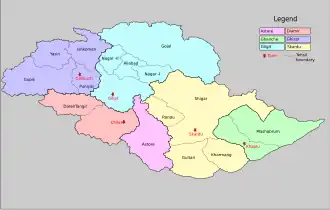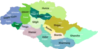 Gilgit-Baltistan is an administrative territory of Pakistan in the northern part of the country. It was given self-governing status on August 29, 2009.[1] Gilgit-Baltistan comprises 14 districts within three divisions. The four districts of Skardu Kharmang Shigar and Ghanche are in the Baltistan Division, four districts of Gilgit Ghizer Hunza and Nagar districts which were carved out of Gilgit District are in the Gilgit Division and the third division is Diamir, comprising Chilas and Astore (which was carved out of the Diamir District in 2004). The main political centres are the towns of Gilgit and Skardu.