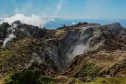Basse-Terre is a volcanic island.[6] The Lesser Antilles are at the outer edge of the Caribbean Plate, and Guadeloupe is part of the outer arc of the Lesser Antilles Volcanic Arc. Many of the islands were formed as a result of the subduction of oceanic crust of the Atlantic Plate under the Caribbean Plate in the Lesser Antilles subduction zone. This process is ongoing and is responsible for volcanic and earthquake activity in the region. Guadeloupe was formed from multiple volcanoes, of which only La Grande Soufrière is not extinct.[7] Its last eruption was in 1976, and led to the evacuation of the southern part of Basse-Terre. 73,600 people were displaced throughout three and a half months following the eruption.