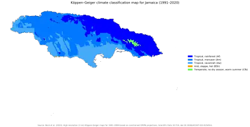 Two types of climate are found in Jamaica.[1] An upland tropical climate prevails on the windward side of the mountains, whereas a semiarid climate predominates on the leeward side.[1] Warm trade winds from the east and northeast bring rainfall throughout the year.[1] The rainfall is heaviest from May to October, with peaks in those two months.[1] The average rainfall is 1,960 millimetres (77.2 in) per year.[1] Rainfall is much greater in the mountain areas facing the north and east, however.[1] Where the higher elevations of the John Crow Mountains and the Blue Mountains catch the rain from the moisture-laden winds, rainfall exceeds 5,080 millimetres (200 in) per year.[1] Since the southwestern half of the island lies in the rain shadow of the mountains, it has a semiarid climate and receives fewer than 760 millimetres (29.9 in) of rainfall annually.[1]