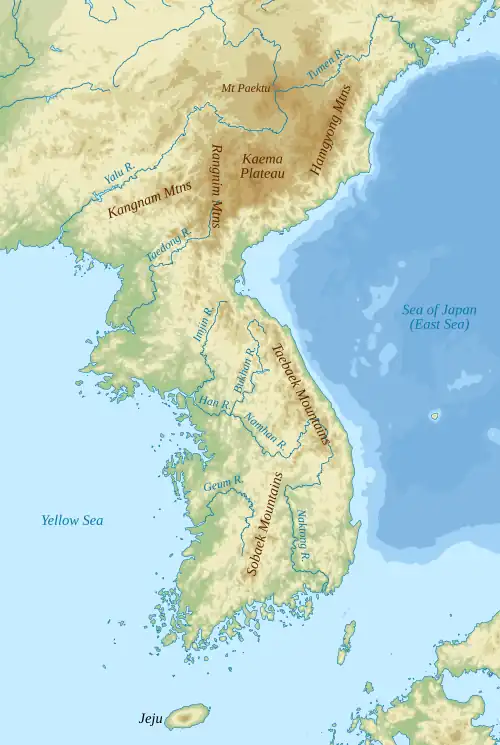 The principal drainage divide (named Baekdu-daegan) runs north to south, beginning with the Rangnim Mountains bisecting the north and continuing down the eastern side of the peninsula as the Taebaek Mountains. Several lower, secondary mountain ranges, including the Kangnam Mountains and Sobaek Mountains run southwest from the main dividing range.[3] They developed along the tectonic line of Mesozoic orogeny. Some significant mountains include Mount Sobaek (1,439 m or 4,721 ft), Mount Kumgang (1,638 m or 5,374 ft), Mount Seorak (1,708 m or 5,604 ft), Mount Taebaek (1,567 m or 5,141 ft), and Mount Jiri (1,915 m or 6,283 ft).