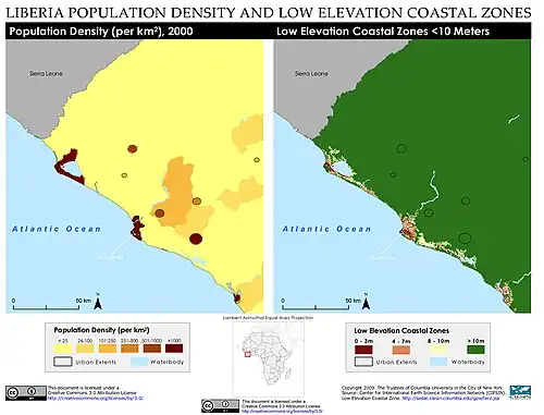 Population density and low elevation coastal zones. Monrovia is especially vulnerable to sea level rise.