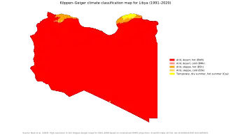 Within Libya as many as five different climatic zones have been recognized, but the dominant climates are the hot-summer Mediterranean climate and the hot desert climate (Köppen climate classification Csa and BWh). In most of the coastal lowland, the climate is intense Mediterranean, with hot or very hot summers and extremely mild winters. Rainfall is scant.