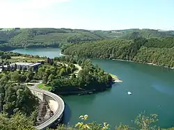 The town of Esch-sur-Sûre nestles at one end of the lake. Immediately above it, the river has been dammed to form a hydroelectric reservoir extending some 10 km (6 mi) up the valley. The Upper Sûre dam was built in the 1960s to meet the country's drinking water requirements