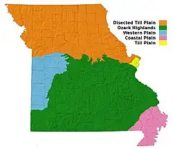 Missouri, a state near the geographical center of the United States, has three distinct physiographic divisions: