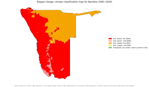 Weather and climate in the coastal area are dominated by the cold, north-flowing Benguela Current of the Atlantic Ocean which accounts for very low precipitation totalling 50 millimetres or 2 inches per year or less, frequent dense fog, and overall lower temperatures than in the rest of the country.[14] In winter, occasionally a condition known as Berg wind or Oosweer (Afrikaans: East weather) occurs, a hot dry wind blowing from the inland to the coast. As the area behind the coast is a desert, these winds can develop into sand storms with sand deposits in the Atlantic Ocean visible on satellite images.[18]
