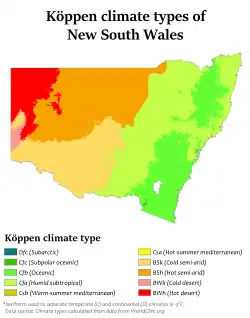 Over half of New South Wales has an arid to semi-arid climate, where the rainfall is quite low. Summer temperatures are often very hot, while winter nights can be cold. Most of the rest of the state has a humid subtropical climate or an oceanic climate. Precipitation varies throughout the state. The north-west receives the least, getting less than 180 mm (7 in) annually, while most of the east receives between 700 and 1,400 mm (28 and 55 in) of rainfall.[3] Rainfall can be as high as 2,000 to 2,500 millimetres (79 to 98 in) in the wettest areas, such as Charlotte Pass[4] and Dorrigo. In the south, precipitation is heaviest in winter because of cold fronts which move across Australia, while in the north, rain is heaviest in summer from tropical systems and even cyclones on rare occasions.[3] During winter, the coastal plain cane be relatively dry because of foehn winds which blow from the Great Dividing Range.[5] The mountain can block cold fronts coming from the Southern Ocean, and can produce foehn winds on the leeward side.[6][7]