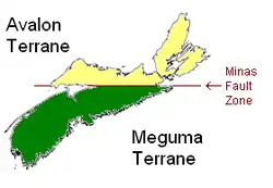 The geological history of the province spans more than 1.2 billion years [1]. Continental drift led to the southern half of the province's mainland portion, the Meguma terrane, once being attached to Africa whereas the Avalon terrane comprising the northern half, including Cape Breton Island, was once attached to Scandinavia and Scotland. The Meguma terrane became joined to the present North American landmass as part of the Appalachian orogeny. Composed largely of Cambrian to Ordovician sedimentary deposits, it is joined to the Avalon terrane along the Minas Fault Zone, which runs east–west from Chedabucto Bay to Cobequid Bay.