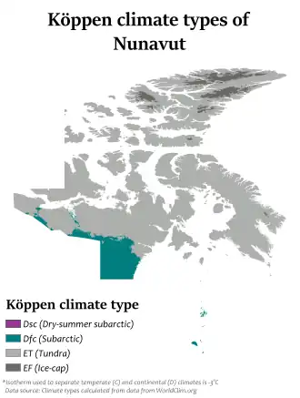 Nunavut experiences a polar climate in most regions, owing to its high latitude and lower continental summertime influence than areas to the west. In more southerly continental areas, very cold subarctic climates can be found, due to July being slightly milder than the required 10 °C (50 °F).