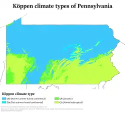 Pennsylvania has three general climate regions, which are determined by altitude more than latitude or distance from the oceans. Most of the state falls in the humid continental climate zone. The lower elevations, including most of the major cities, has a moderate continental climate Köppen climate classification (Dfa), with cool to cold winters and hot, humid summers. Highland areas have a more severe continental climate (Köppen Dfb) with warm, humid summers and cold, more severe and snowy winters. Extreme southeastern Pennsylvania, around Philadelphia borders a humid subtropical climate (Köppen Cfa), with milder winters and hot, humid summers.