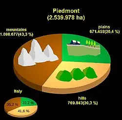 The Geography of Piedmont is that of a territory predominantly mountainous, 43.3%, but with extensive areas of hills which represent 30.3% of the territory, and of plains (26.4%).