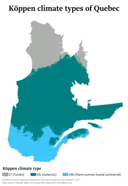 In general, the climate of Quebec is cold and humid.[17] The climate of the province is largely determined by its latitude, maritime and elevation influences.[17] According to the Köppen climate classification, Quebec has three main climate regions.[17] Southern and western Quebec, including most of the major population centres and areas south of 51oN, have a humid continental climate (Köppen climate classification Dfb) with four distinct seasons having warm to occasionally hot and humid summers and often very cold and snowy winters.[17][18]