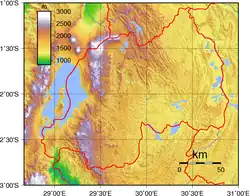 The watershed between the major Congo and Nile drainage basins runs from north to south through Rwanda, with around 80 percent of the country's area draining into the Nile and 20 percent into the Congo via the Rusizi River.[7] The country's longest river is the Nyabarongo, which rises in the south-west, flows north, east, and southeast before merging with the Akanyaru to form the Kagera; the Kagera then flows due north along the eastern border with Tanzania. The Nyabarongo-Kagera eventually drains into Lake Victoria, and its source in Nyungwe Forest is a contender for the as-yet undetermined overall source of the Nile.[8]