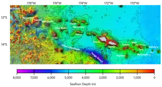 Vailuluʻu is a volcanic seamount discovered in 1975. It rises from the sea floor to a depth of 593 m (1,946 ft) and is located between Taʻu and Rose islands at the eastern end of the Samoa hotspot chain. The basaltic seamount is considered to mark the current location of the Samoa hotspot. The summit of Vailuluʻu contains a 2,000 m (6,600 ft) wide, 400 m (1,300 ft) deep oval-shaped caldera. Two principal rift zones extend east and west from the summit, parallel to the trend of the Samoan hotspot. A third less prominent rift extends southeast of the summit.[2]