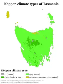 - ^ Discover Tasmania. "Climate and weather". Writer for Discover Tasmania. Tasmania, Australia: Discover Tasmania. Retrieved 27 October 2016.