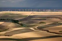 Farther east, the climate becomes less arid, with annual rainfall increasing as one goes east to 21.2 inches (540 mm) in Pullman, near the Washington–Idaho border.[10] The Okanogan Highlands and the rugged Kettle River Range and Selkirk Mountains cover much of the state's northeastern quadrant. The Palouse southeast region of Washington was grassland that has been mostly converted into farmland, and extends to the Blue Mountains.[11]