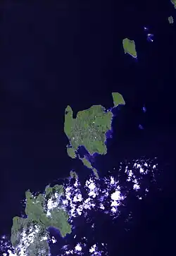 Madeline Island in Lake Superior is the largest of the Apostle Islands. The community of La Pointe is on the western shore, and the island as a whole has a population of 302.[46] Washington Island in Lake Michigan is 7 miles (11 km) northeast of the tip of the Door Peninsula. The island is five miles wide by eight miles long, and covers an area of 23.51 miles (37.84 km). The town of Washington Island covers the island, as well as surrounding islands, with a total population of 708.[47]