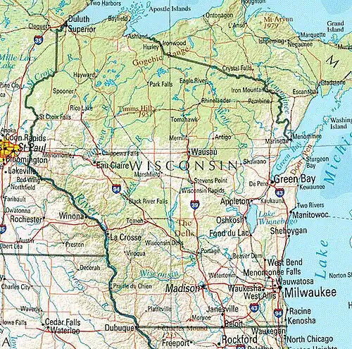 Wisconsin is bordered by Lake Superior and Michigan to the north; by Lake Michigan to the east; by Illinois to the south; by Iowa to the southwest and Minnesota to the northwest. A border dispute with Michigan was settled by two cases, both Wisconsin v. Michigan, in 1935 and 1936.[7] The state's boundaries include the Mississippi and St. Croix Rivers in the west, and the Menominee and Montreal Rivers in the north. The state is in Central Time Zone (UTC-6).[8]