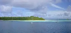 The coral atoll of Diego Garcia is approximately 1,970 nautical miles (3,650 km) east of the coast of Africa (at Tanzania), 967 nautical miles (1,791 km) south-southwest of the southern tip of India (at Kanyakumari) and 2,550 nautical miles (4,720 km) west-northwest of the west coast of Australia (at Cape Range National Park, Western Australia). Diego Garcia lies at the southernmost tip of the Chagos-Laccadive Ridge — a vast submarine range in the Indian Ocean.[13] The total area encompassed by the atoll is 169.6 square kilometres (65.5 sq mi). At the entrance to the lagoon, there are three small islands, and these are East Island (7.49 hectares (18.5 acres)), Middle Island (4.98 hectares (12.3 acres)), and West Island (2 hectares (4.9 acres)).[14] In some areas, the atoll has both marshes and wetlands.[15] The ecosystem consists of undisturbed tropical forests.[16]