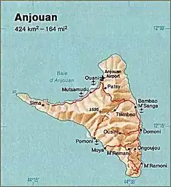 Anjouan, triangular shaped and forty kilometers from apex to base, has an area of 424 square kilometers. Three mountain chains — Sima, Nioumakele, and Jimilime—emanate from a central peak, Mtingui (1,575 m), giving the island its distinctive shape. Older than Grande Comore, Anjouan has deeper soil cover, but overcultivation has caused serious erosion. A coral reef lies close to shore; the island's capital of Mutsamudu is also its main port.