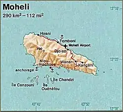 Mohéli is thirty kilometers long and twelve kilometers wide, with an area of 290 square kilometers. It is the smallest of the four islands and has a central mountain chain reaching 860 meters at its highest. Like Grande Comore, it retains stands of rain forest. Mohéli's capital is Fomboni.