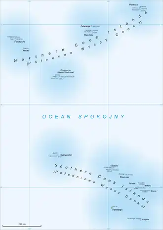 Two terrestrial ecoregions lie within the Cook Islands territory: the Central Polynesian tropical moist forests and the Cook Islands tropical moist forests.[1] From December through to March, the islands are in the path of tropical cyclones, the most notable of which were cyclones Martin (1997) and Percy (2005).[2]