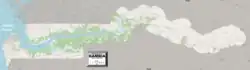 The Gambia is a very small and narrow African country with the border based on the Gambia River. The country is less than 48 kilometres (30 mi) wide at its greatest width. The country's present boundaries were defined in 1889 after an agreement between the United Kingdom and France. It is often claimed by Gambians that the distance of the borders from the Gambia River corresponds to the area that British naval cannon of the time could reach from the river's channel. However, there is no historical evidence to support the story, and the border was actually delineated using careful surveying methods by the Franco-British boundary commission.[1][2] The Gambia is almost an enclave of Senegal and is the smallest country on mainland Africa.