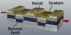 The subsurface of the North Sea area is dominated by grabens: the north-west south-east oriented Lower Rhine Graben under the southern North Sea and the Netherlands,[5] the north–south-oriented North Sea Central Graben that begins north of the Dutch coast and ends in the region east of Scotland, and the Viking Graben along the south-east Norwegian coast.[4]: [97] [5]: [4] The Horn Graben is a smaller graben east of the Central Graben and in front of the Danish coast.[5]: [8] Another smaller structure is known as the Terschelling Graben, which borders the Central Graben in the west, just north of the Netherlands.[6] A larger graben is found in the subsurface below the Skagerrak, this north–south structure is called the Bamble-Oslo Graben.[7] The Viking Graben is separated from the Faeroe Shetland Basin below the Atlantic by the Shetland Platform, the two structures join in the area north-east of the Shetland Islands.[8][9]