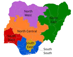 The Federal Republic of Nigeria is divided into six geopolitical zones, commonly called zones. They are a type of administrative division grouping the country's states, created during the regime of president General Sani Abacha. Nigerian economic, political, and educational resources are often shared across the zones.[1][2][3][4][5][6]: 98