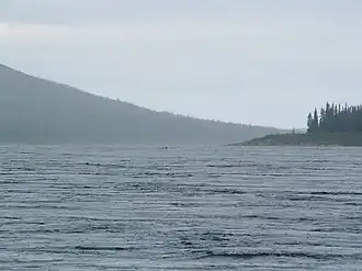 The George River originates about 175 kilometres (109 mi) east of Schefferville in Lake Jannière, between bogs and swamps. The headwater lakes are shallow, connected by rushing rapids. After Lake Advance, the river runs through heavy whitewater until it reaches Indian House Lake (Naskapi: Mushuan Nipi, "Big Lake in the Barrens"),[4] which stretches 60 kilometres (37 mi) if measured by Canadian topo maps, or 100 kilometres (62 mi) if measured by its flatwater character.