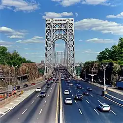 The George Washington Bridge Plaza, also known as GWB Plaza or Bridge Plaza, is the convergence of roads and highways around the site of the George Washington Bridge toll plaza in Fort Lee, New Jersey, United States.[2] The plaza is located north of and parallel to Fort Lee's Main Street. The surrounding busy area is characterized by a mix of commercial and residential uses and an architectural variety that includes parking lots, strip malls, houses, gas stations, mid-rise office buildings and high-rise condominiums. Just to the east is Fort Lee Historic Park, Palisades Interstate Park and the bridge's western tower.