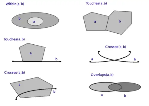 - ^ Egenhofer, M.J.; Franzosa, R.D. (1991). "Point-set topological spatial relations". Int. J. GIS. 5 (2): 161–174. doi:10.1080/02693799108927841.