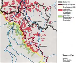 The Germanic-Romance (German-French) language boundary in Lorraine roughly followed the line from Sarrebourg (Saarburg) to Hayange (Hayingen) until well into the 20th century. A detailed map of the boundary is given in the article on the Lorraine Franconian dialect. The Lorraine region northeast of this linguistic boundary in the present-day départements of Moselle and Bas-Rhin (the Alsace bossue) and in the present-day federal state of Saarland was called German Lorraine (Deutsch-Lothringen). Nancy, the historic capital of Lorraine, and Metz, the present capital of the region of Lorraine, both lie on the French side of the boundary. There are clues to the historic boundary in the names of settlements like Audun-le-Tiche (Deutsch-Oth or German Audun) and Audun-le-Roman (Welsch-Oth or Romance Audun) or the names of the two headstreams of the Nied, the Nied Allemande (Deutsche Nied or German Nied) and the Nied Française (Französische Nied or French Nied), which lie on either side of the language boundary and merge almost exactly on the line itself.