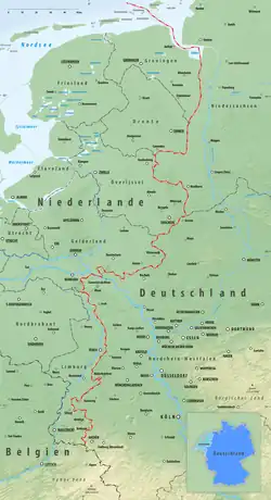 The border is located in the northwestern part of Germany and the east of the Netherlands. The border runs as a fairly irregular line from the shore of the Dollart bay which is part of the Ems river estuary in the north to the Belgium–Germany–Netherlands tripoint at Vaalserberg. The length of the border is around 570 kilometres (350 mi) in length, although the straight distance between the two border end points is 288 kilometres (179 mi).