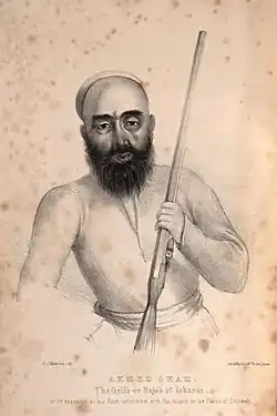 In November 1839, Dogra commander Zorawar Singh, whose allegiance was to Gulab Singh, started his campaign against Baltistan.[49] By 1840 he conquered Skardu and captured its ruler, Ahmad Shah. Ahmad Shah was then forced to accompany Zorawar Singh on his raid into Western Tibet. Meanwhile, Baghwan Singh was appointed as administrator (thanadar) in Skardu. But in the following year, Ali Khan of Rondu, Haidar Khan of Shigar and Daulat Ali Khan from Khaplu led a successful uprising against the Dogras in Baltistan and captured the Dogra commander Baghwan Singh in Skardu.[50]