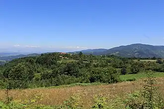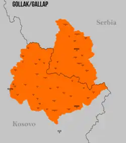 Gollak (Albanian definite form: Gollaku; Serbian: Гољак, romanized: Goljak) or Gallap (Albanian definite form: Gallapi) is a mountainous and ethnographic region in the eastern part of Kosovo and partially in Serbia, bordering the Llap region to the North, the Kosovo field to the west, the Anamorava valley to the south and straddling along the border with Serbia.[2] The cities of Pristina and Gjilan in Kosovo are located by the mountains. The highest peak, Bjeshka e Artanës, has an elevation of 1260 meters 1,260 m (4,134 ft) above sea level.[3] Gollak itself is split into Upper Gollak and Lower Gollak.