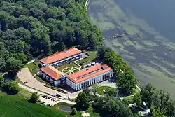 In 1817/1818, Prince Wilhelm Malte I of Putbus had a 50 metre long bath house built here for his residence town of Putbus. The then Frederick William Baths (Friedrich-Wilhelm-Bad) were, like several other buildings in Putbus, designed by Johann Gottfried Steinmeyer. An imposing avenue runs from Putbus, two kilometres away, to the impressive facade of the building, which is characterised by a hypostyle hall with 18 white columns. The present Goor Bath House (Badehaus Goor) was modified several times over the course of time. After the Second World War it was used as a holiday home for the Ironwork Combine East (Eisenhüttenkombinat Ost, EKO) in Eisenhüttenstadt. After a thorough renovation and rebuilding it was re-opened in April 2007, expanded with modern annexes, as a spa hotel.