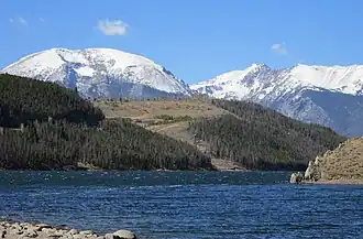 ![]() Buffalo Mountain (left) at the southern end of the Gore Range seen from Dillon Reservoir. | |