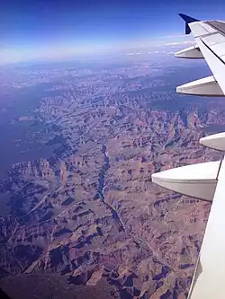 The Grand Canyon[a] is a steep-sided canyon carved by the Colorado River in Arizona, United States. The Grand Canyon is 277 miles (446 km) long, up to 18 miles (29 km) wide and attains a depth of over a mile (6,093 feet or 1,857 meters).[6]: 902
