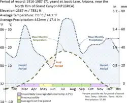 Temperatures on the North Rim are generally lower than those on the South Rim because of the greater elevation (averaging 8,000 feet or 2,400 meters above sea level).[18] Heavy rains are common on both rims during the summer months. Access to the North Rim via the primary route leading to the canyon (State Route 67) is limited during the winter season due to road closures.[19]