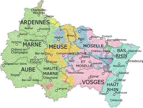 Grand Est is the result of territorial reform legislation passed in 2014 by the French Parliament to reduce the number of regions in Metropolitan France—the part of France in continental Europe—from 22 to 13.[17] Grand Est is the merger of three regions: Alsace, Champagne-Ardenne, and Lorraine.