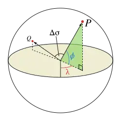 Let and be the geographical longitude and latitude of two points 1 and 2, and be their absolute differences; then , the central angle between them, is given by the spherical law of cosines if one of the poles is used as an auxiliary third point on the sphere:[2]